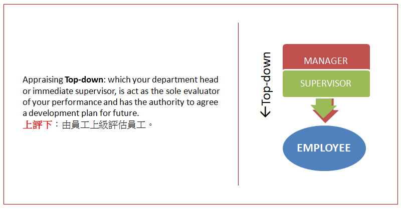 Through this 180 degree eAppraisal System, we would like to enhance the level of staff's self review on his/her performance. Also, through the discussion and evaluation process between the staff and appraiser, it can help to provide formal feedback to staff on his/her performance and identify performance gaps, if any, and determine improvement areas and development needed to fill these gaps. Finally, this eAppraisal System facilitates our HR analysis by collecting data and reviewing staff members' performance in a more systematic way and providing an objective reference for salary administration.