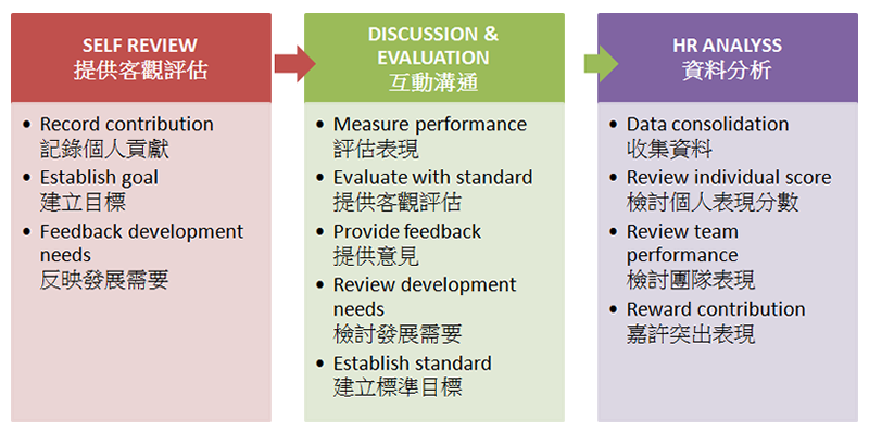 本系統除提供員工自我評估機制外,更鼓勵員工與評估者互動溝通,以提供正面意見,給員工了解其表現差異、不足之處及個人發展需要。本系統更方便公司收集及分析資料。